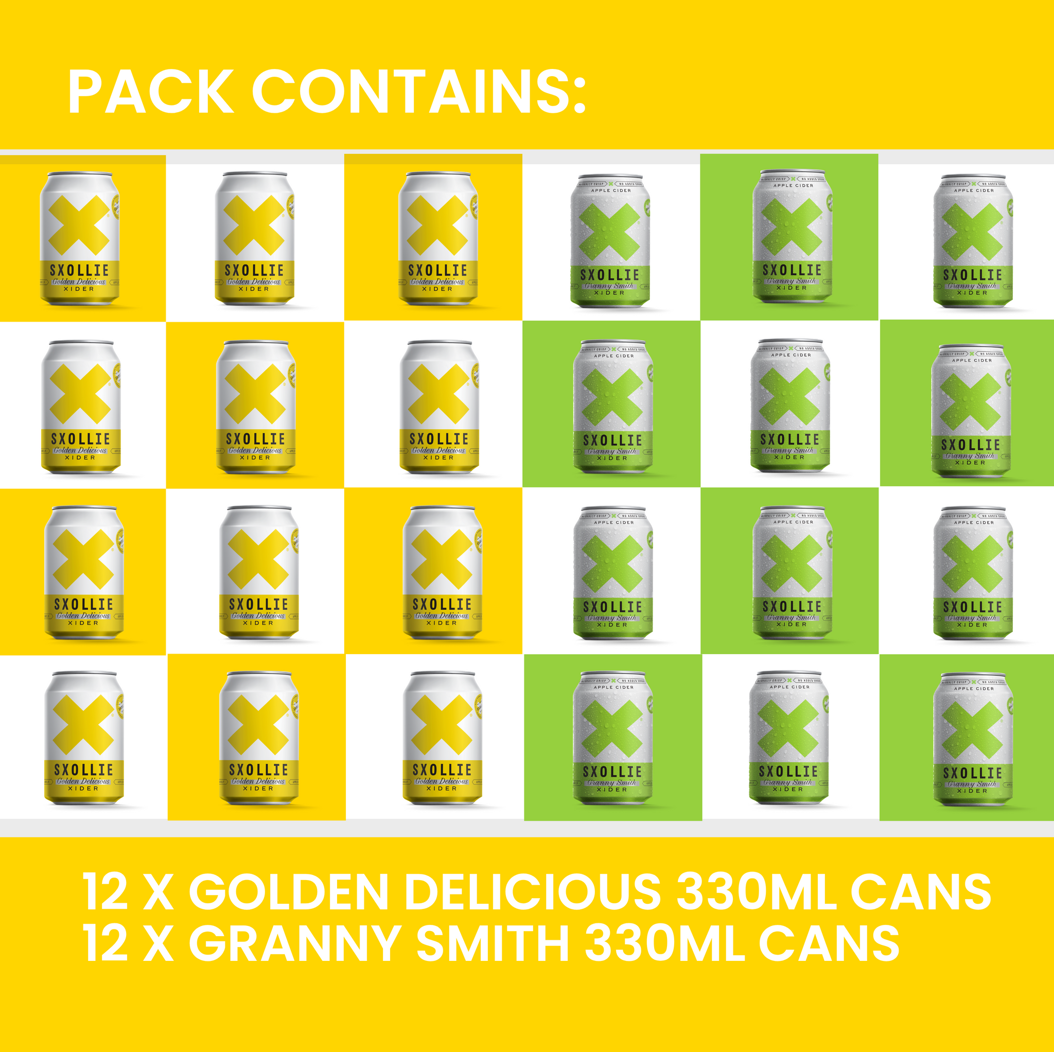 Meet the best way to get to know SXOLLIE! A mixed case of our two icons. Half crisp, refreshing Granny Smith. Half smooth, mellow Golden Delicious.